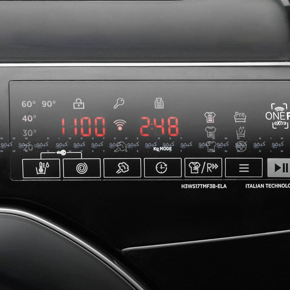 - Buttons Selection: Start / Pause, PreWash, Extra Rinse, Hygiene Plus, Rapid / Stain Level, Delay Start, Steam, Spin Speed, Water Temperature