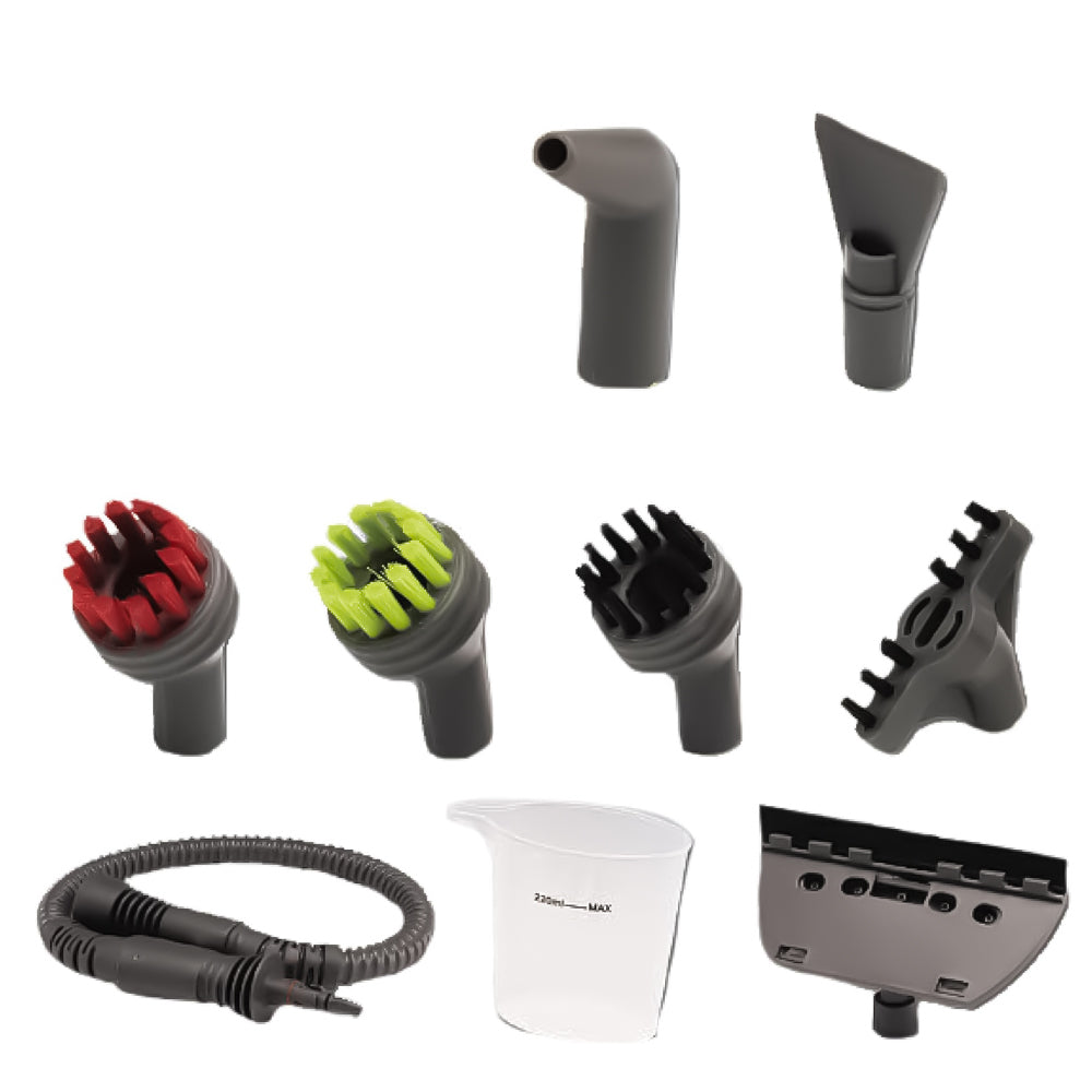 • Attachments: Pouring Jug, Extension Hose, Detailed Brush Kit With 3 Color Coded Brushes, Angled Concentrated Tool, Window Squeegee, Flat Pad, Flat Scraping Tool, 2 Microfiber Cleaning Cloths, Accessory Nozzle