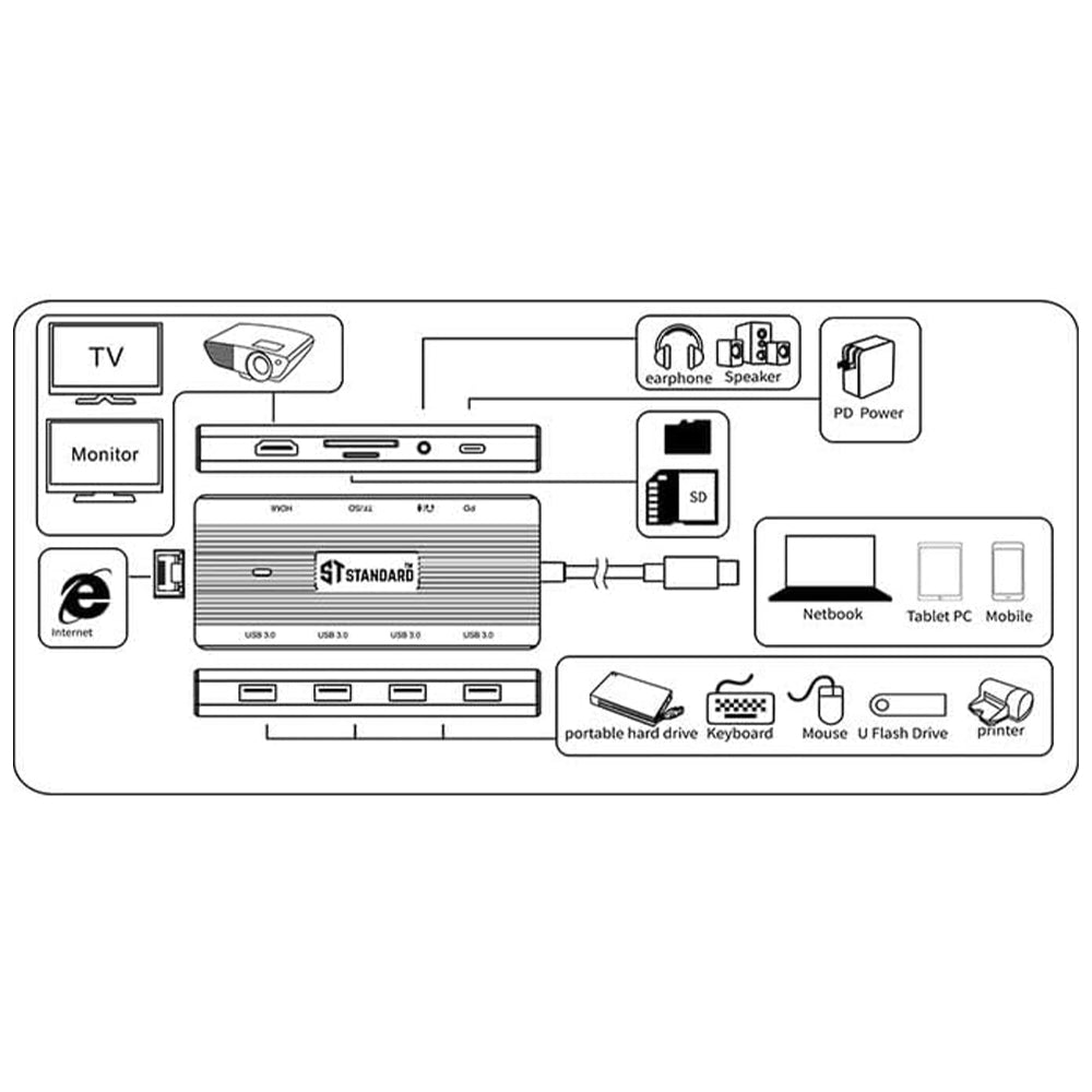 - To: 1x PD3.0 Type-C + 1x 3.5mm Audio + 4× USB 3.0 + 1×HDMI + 1x Rj45 + 1x SD Card + 1x TF Card
